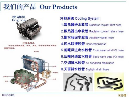 冷卻系統 Cooling System: 1.散熱器進水軟管 Radiator coolant inlet hose 2.散熱器出水軟管 Radiator coolant return hose 3.副水箱回水膠管 Auxiliary water hose 4.回水聯接膠管 Connection hose 5.前暖風(fēng)進出水膠管 Front warm wind I/O hose 6.後暖風(fēng)進出水膠管 Back warm wind I/O hose 7.空調(diào)排水軟管 Air condition drain hose 8.天窗排水膠管 Skylight drain hose