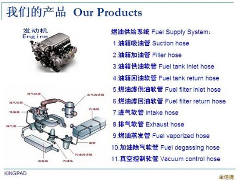 燃油供給(gěi)系統FuelSupplySystem: 1.油箱吸油管Suctionhose 2.油箱加油管Fillerhose 3.油箱供油軟管Fueltankinlethose 4.油箱回油軟管Fueltankreturnhose 5.燃油濾供油軟管Fuelfilterinlethose 6.燃油濾回油軟管Fuelfilterreturnhose 7.進氣軟管Intakehose 8.排氣軟管Exhausthose 9.燃油蒸發(fā)管Fuelvaporizedhose 10.加油除氣軟管Fueldegassinghose 11.真空控制軟管Vacuumcontrolhose